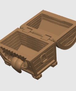 Chest-shaped body styled after a treasure box, with a lid that opens to store dice.